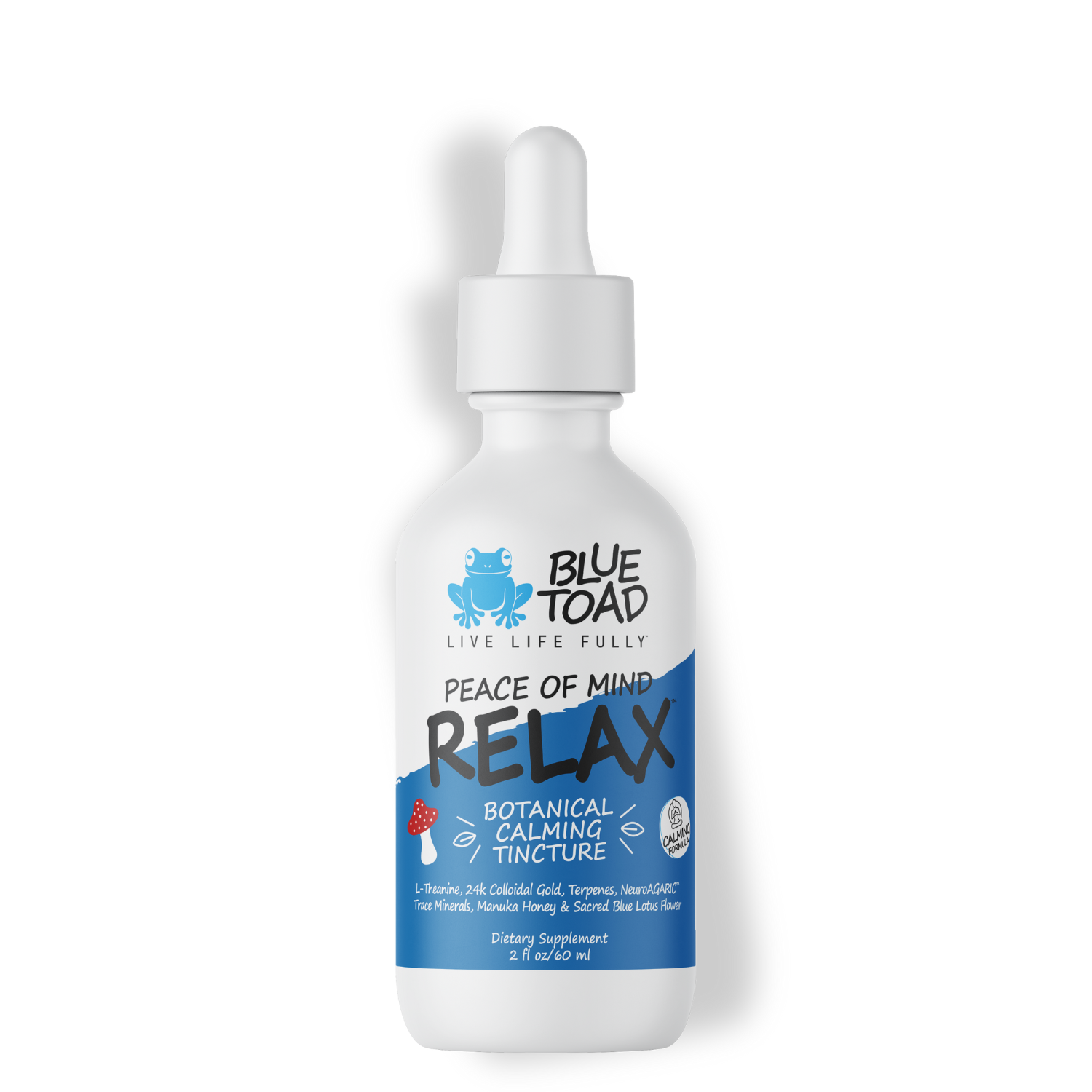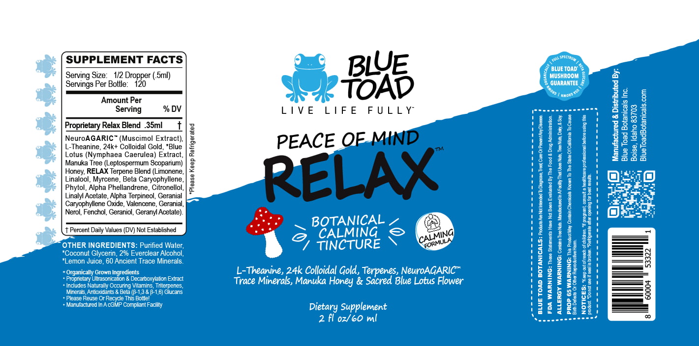 Blue Toad™ RELAX Tincture Is A One-Of-A-Kind Tincture Is Made With Muscimol Extract, 24K Colloidal Gold, Green Tea Extracted L-Theanine, New Zealand Activated Manuka Honey, Organic Sacred Blue Lotus Flower Extract, Our Proprietary RELAX Terpene Blend & 54 Ancient Trace Minerals!